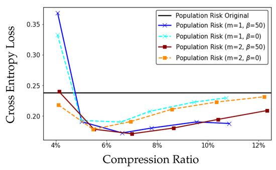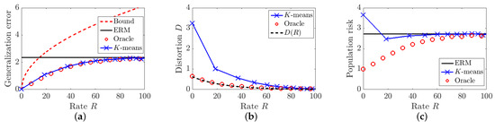 From the properties of the distortion-rate function [36], we know that is a decreasing function of R. Thus, we see that as R decreases the first term in (15), which corresponds to the generalization error, decreases, while the second term, which corresponds to the empirical risk, increases. Due to this tradeoff, it may be possible for the bound in (15) to be smaller due to compression, i.e., using a smaller rate R. This indicates that the population risk could improve with compression algorithm, which minimizes the upper bound .
