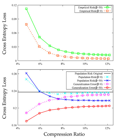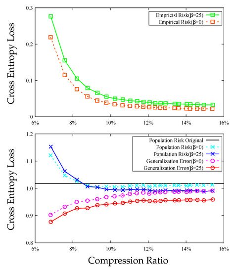 where is an upper bound on the expected difference between the population risk of and the empirical risk of the original model W on training dataset S. Note that is independent of the compression algorithm. Therefore, the bound in (14) can be viewed as an upper bound of the population risk of the compressed model .
