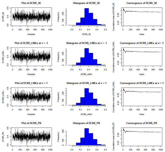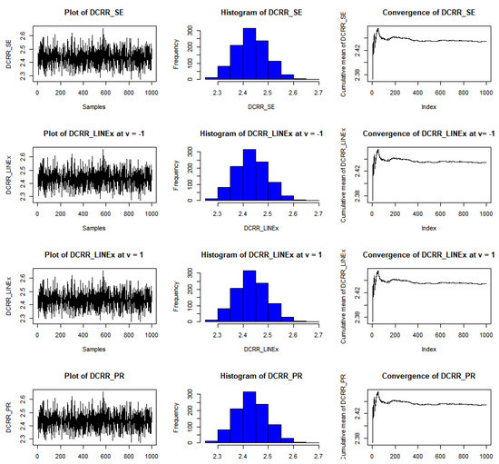 For the Lindley distribution at , a numerical analysis is conducted in this part to examine the performance of the Bayesian estimates of In Bayesian literature, the Metropolis–Hastings (MH) algorithm (see [32]) is one of the most well-known subclasses of the MCMoC technique for simulating deviations from the posterior density and producing good approximation results. MCMoC simulations are run for selected sample sizes and loss functions. R 4.1.1 will be used to run the MH algorithm.