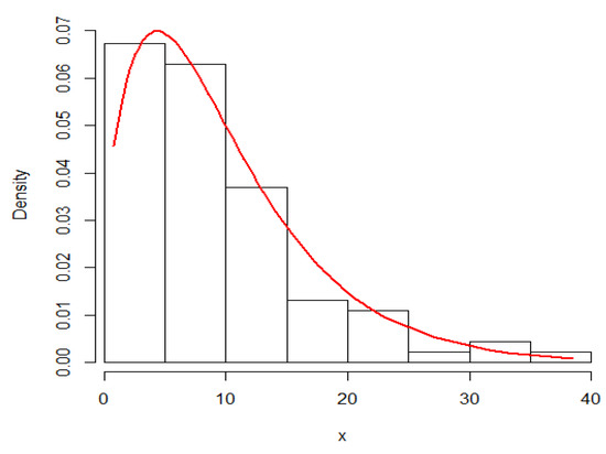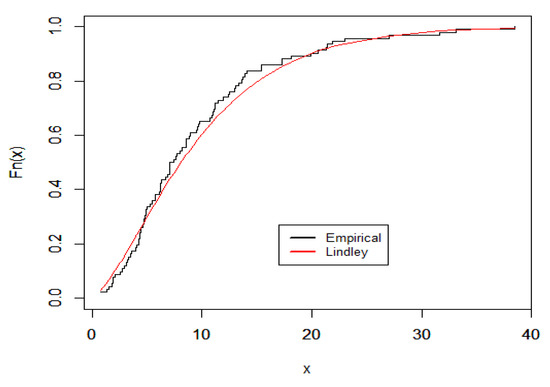 Here, we demonstrate the technique described in the preceding section by using an actual data set that represents the waiting times (in minutes) before receiving service for 100 bank customers. Reference [23] discussed the detailed statistics that showed the data fitted the Lindley distribution. Figure 8 and Figure 9 provide plots of fitted PDF and CDF for the data under consideration. The Bayes estimates of the DCRRéE at t = 0.5 and 1.5 at the intended loss functions are reported in Table 7.