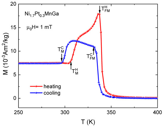 The temperature-dependent magnetization curves of NiPt MnGa measured in both cooling (blue) and heating (red) cycles in a small magnetic field of 1 mT are shown in Figure 1. We obtained the martensitic and ferromagnetic transition temperatures upon cooling (heating) and from the curves. Upon cooling, the paramagnetic–ferromagnetic transition started at 342 K, followed by a sharp increase in the magnetization until 331 K. After that, still increased, but with a strongly reduced rate until we reached the temperature where a sudden drop in the magnetization indicates the martensitic transition. The martensitic finish temperature K. The peak and drop in the curve are caused by the large magnetocrystalline anisotropy of the martensite phase. We observed similar features in for the heating cycle; however, this was with a pronounced hysteretic behavior between both transitions. For the ferromagnetic–paramagnetic transition, the hysteresis width was about 4 K; for the martensitic transition, the hysteresis width was significantly larger, around 10 K. The hysteresis was taken as the difference between the respective starting temperatures on heating and the finish temperatures on cooling (see Figure 1). The hysteresis width observed in the present work was larger in comparison with previously reported results [2]. We note that we recorded at a very small magnetic field of only 1 mT. As the magnetic field stabilizes the phase with the higher magnetic moment—in this case the martensitic phase—we expect the hysteresis of the inverse transition to increase with increasing field.