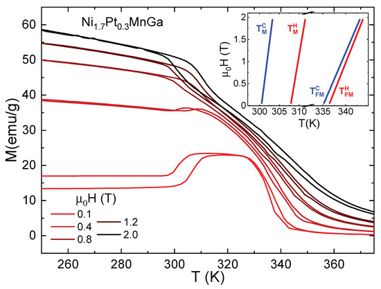 Selected isofield magnetization curves at different fields between T, as indicated, on both heating and cooling for NiPtMnGa exhibiting structural and magnetic transitions. The inset illustrates the phase diagram.