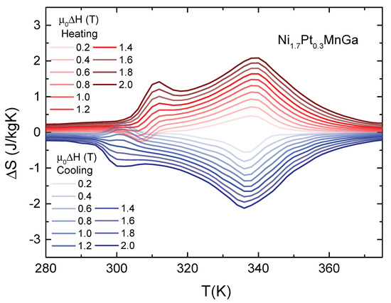 The isothermal entropy changes for heating and cooling, calculated from for magnetic field changes from 0 to T, from 0 to 0.4 T and so forth up to 2 T in T steps, are depicted in Figure 3. exhibits two peaks centered at 310 K and 340 K, which are related to the martensitic and the paramagnetic–ferromagnetic transitions, respectively. For a magnetic-field change of T, we find, upon heating, J/kgK and J/kgK. The peak at the ferromagnetic–paramagnetic transition increases continuously upon increasing the magnetic field change, reaching J/kgK for T, while changes sign reaching J/kgK for T. Moreover, we found that, although there is a slight shift in the temperature position of the peaks, the amplitude of is quite similar for both heating and cooling cycles.