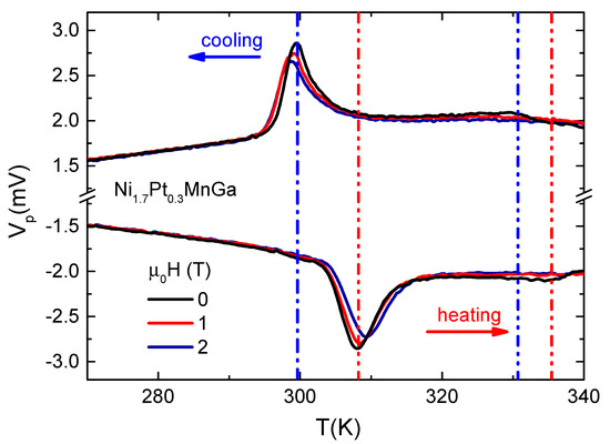 The Peltier voltage, a value that is directly proportional to the heat capacity [30], as a function of temperature for both cooling and heating processes for magnetic fields of 0, 1 and 2 T is depicted in Figure 4. Here is the temperature sweeping rate, in our case K/min. As expected, the Peltier voltage shows a peak around the martensitic transition, which is a signature of the presence of latent heat and the first-order nature of the transition. There is also a large hysteresis between the peak position on cooling and heating cycles. On heating (cooling), the application of a magnetic field shifts the transition to higher (lower) temperatures, with a shift of about 2 K for a magnetic field T compared to zero field. For the paramagnetic–ferromagnetic transition the Peltier voltage does not show a peak, as expected for a second-order phase transition. Only a small shoulder is observed at 0 T, which is almost completely suppressed by the application of a magnetic field of 2 T. Moreover, a small thermal hysteresis of approximately 5 K is observed between the cooling and heating cycles for the paramagnetic–ferromagnetic transition.