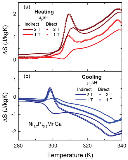 The behavior of measured in the temperature interval of the martensitic transformation upon heating and cooling is of particular interest because it can give insights into the importance of irreversible effects that are relevant for cooling applications. We first discuss the curves obtained directly from the heat-flow experiment (see Figure 5). In principle, one expects that recorded on cooling mimics the dependence of the isothermal magnetic entropy change on heating with just a change in the temperature position of the peaks, indicating the transitions. For the ferromagnetic–paramagnetic transition, the behavior for both cooling and heating processes is similar. In the heating processes, we find that reaches and for magnetic field changes of 1 and 2 T respectively, at 338 K and in the cooling process the maximum of appears at 333 K, with maximum values of and for magnetic field changes of 1 and 2 T, respectively. More interestingly, for the martensitic transition upon cooling, contrary to obtained from magnetization curves, we observe an inverse magnetocaloric effect at 299 K with of J/kgK for T and J/kgK, for T. The origin of the apparent discrepancy between the from cooling and heating cycles can be explained based on the strong hysteresis of the temperature and magnetic-field induced thermoelastic martensitic transformation in NiPtMnGa (see inset of Figure 2). Upon heating, around the martensitic transition temperature, the application of a magnetic field easily converts the martensite into ferromagnetic austenite, corresponding to the observed positive peak. Upon cooling, at zero magnetic field, there is a temperature-induced conversion of the sample to the martensite phase. In the applied magnetic field, it is necessary to determine the entropy change, and the converted sample does not return to the austenitic phase and the ‘negative’ MCE is governed by the magnetic properties of both phases.