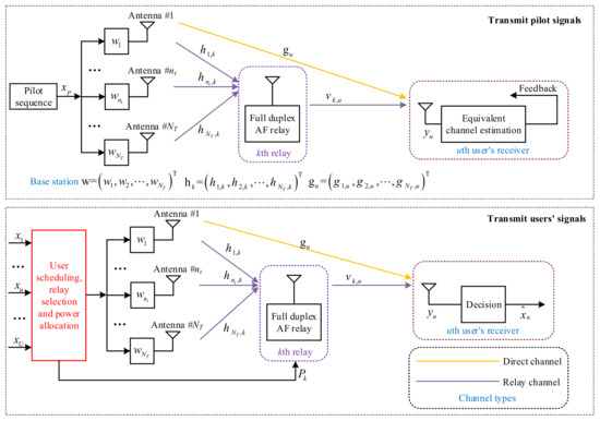 After receiving the feedback equivalent channels from the users, the BS applies user scheduling, relay selection, and power allocation to transmit the users’ signals. The received signal of the uth user is