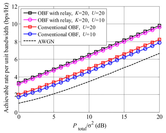 Figure 2 presents the achievable rate of MOBR and the conventional OBF without relay. All curves raise with the increased . Comparing the curves between MOBR and the conventional OBF systems, we found that the relay scheme can significantly improve the achievable rate of an OBF system. The reason is that relays enhance the received SNRs through the cooperative transmission method and multi-relay selection. Furthermore, all curves are higher than the AWGN case, due to multi-user and multi-relay selection gains.