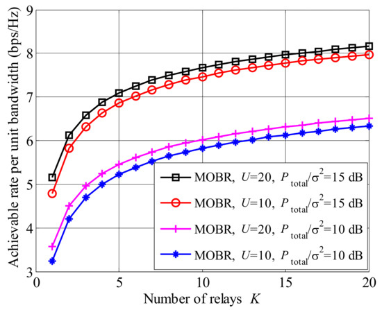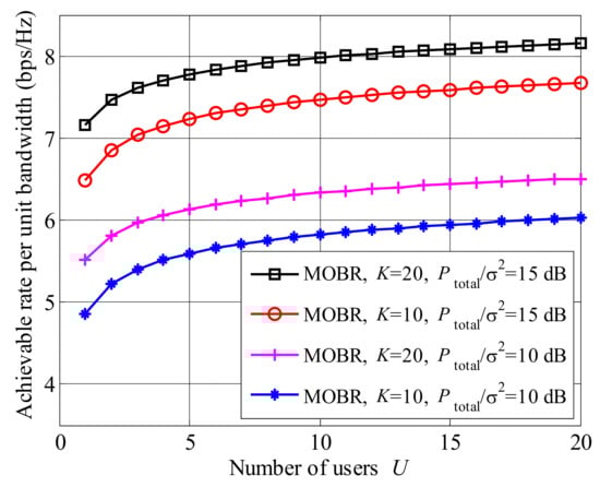 To illustrate the influence of the user number U, we plot the achievable rate versus the number of users in Figure 4. The achievable rate of MOBR improves as the number of users increases. Moreover, compared to Figure 3, the growth of the achievable rate with the number of users U is less than that with the number of relays K. When , the curves are almost stable. The reason is that the gain from multi-user selection approximates , which is stable with a large U.
