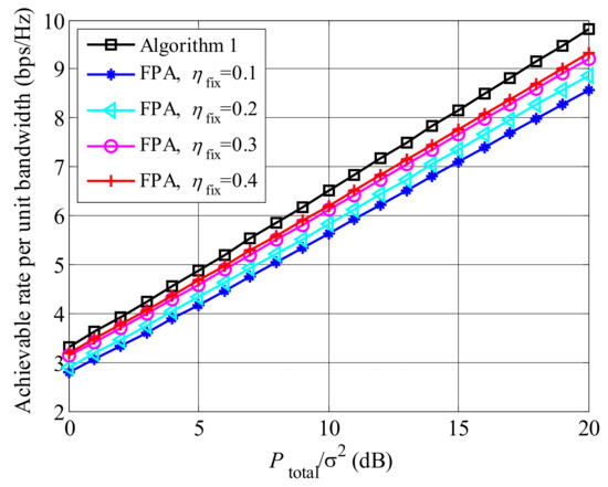 We compare the achievable rates between Algorithm 1 and fixed power algorithm (FPA) [27] in Figure 5, where and . For FPA scheme, users and relays are scheduled based on (29), and and . It is seen that Algorithm 1 obtains higher achievable rate than the FPA scheme, no matter of the value of , since the proposed algorithm can adaptively adjust the power allocation to maximize the achievable rate according to the equivalent channels and .