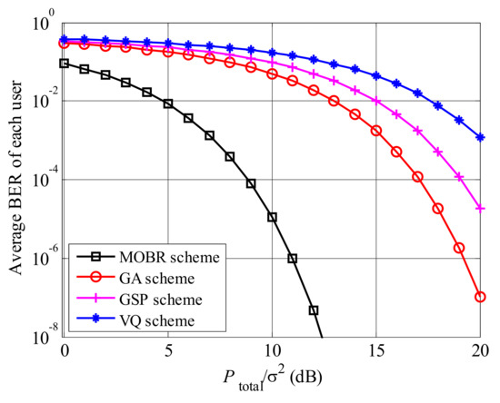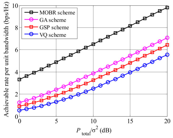 In Figure 6, we present the comparisons of achievable rates between MOBR and other preprocessing schemes, i.e., genetic algorithm (GA) [28], Grassmannian subspace packing (GSP) [29], and vector quantization (VQ) [30], under low feedback information condition, where and . In GA, GSP, and VQ schemes, similar to the MOBR scheme, relays are introduced to enhance the received signals. The achievable rate of MOBR is the largest, followed by GA, GSP, and VQ, since MOBR can obtain the highest multi-relay selection gain and extra multi-user selection gain. Comparing GA, GSP, and VQ schemes, the GA scheme achieves the highest rate, due to the lowest distortion of the preprocessing vector.