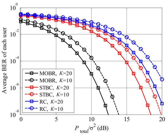 The comparisons of BERs among MOBR, STBC, and RC, where .