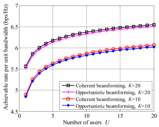 Figure 9 presents the comparison between opportunistic beamforming and coherent beamforming [33] with relay systems, where dB and . It is seen that coherent beamforming provides a higher achievable rate than opportunistic beamforming, while, the gap between coherent beamforming and opportunistic beamforming is small.