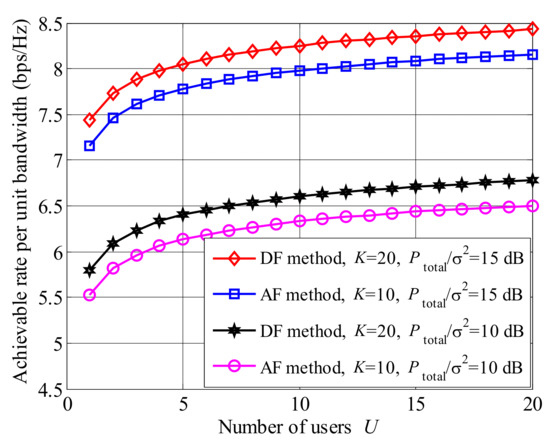The comparison of the achievable rate between AF and decode-and-forward (DF) methods is presented in Figure 11. It can be seen that the curves of the DF method are higher than those of the AF one, regardless of the values of both K and . The reason is that both noise and signal are simultaneously amplified, when AF method is applied. However, both the complexity of AF method is lower than that of DF one. Therefore, there is a trade-off between the performances of achievable rate and complexity.