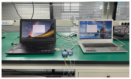 In Figure 12, two mobile workstations are set to be the transmitter and receiver. Channel fading coefficients are generated at the transmitter. Two workstations are connected through a wire. Different parameters are considered. Then, both the achievable rate and average BER of the proposed scheme are presented in Table A1. Compared to both Figure 6 and Figure 7, the simulated and experimental results are coincident.