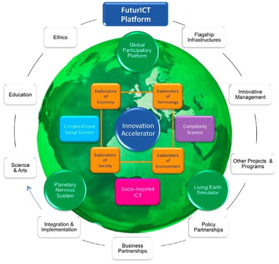 In a paper published in the Cornell-based international electronic archive “Arxiv” http://arxiv.org/ (accessed on 25 September 2021) [], the FuturICT initiative called for science to catch up with the speed at which new problems and opportunities were arising in a changing world as a consequence of globalization and of technological, demographic, and environmental changes. Its initiative had started as an answer to the rising perception of the serious crises that ‘humankind is facing’ in order to ‘develop new ways to tackle the global challenges of humanity in the 21st century.’ With connectivity between people rapidly increasing, so the argument went, information and communication technologies would be exploitable in order to achieve major breakthroughs that would go beyond stepwise improvements in other areas. Borrowing heavily from physics terminology, FuturICT claimed to use ICT to ‘explore social life on Earth, and everything it relates to,’ in the same way that scientists over the past decades were trying to understand ‘the physical world.’ This meant being visionary, ambitious, and providing novel concepts.