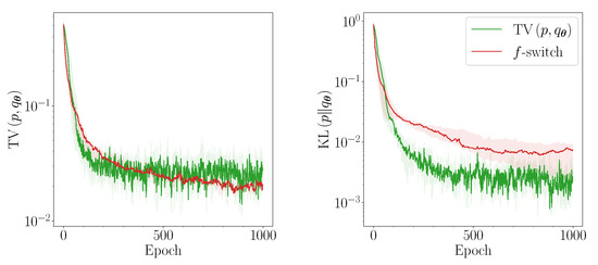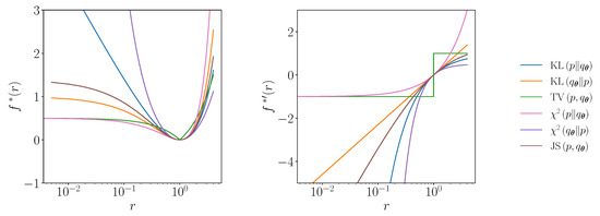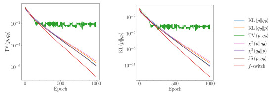 It is evident from the left panel of Figure 1 that some divergences, including TV, vary slowly in the region where , and are therefore more liable to saturation in the initial stages of training. Other divergences, such as forward KL and reverse , generate strong gradients in this region. In the limiting case where p and have disjoint supports, TV and JS saturate, whereas forward KL diverges [78]. This problem is well known within the context of training generative adversarial networks; since an idealised formulation optimises JS, several alternative cost functions have been proposed to mitigate its slow initial convergence [64,77,78,79].