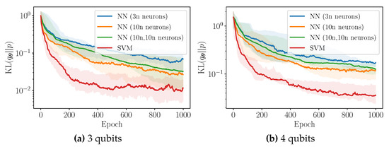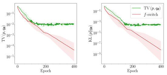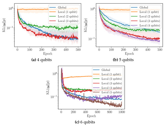 One may rationalise the different rates of convergence for each divergence at the beginning of training by considering the following argument [50,64,77]. Consider n qubits, such that there are different values of . For a successful training, all these values need to converge towards 1 (which implies our goal that ). Now suppose we were to estimate the divergence in Equation (6) using a set of samples from the target distribution . At the beginning of training, is initialised at random and is therefore expected to be far from the target. This means that for most of the samples. In other words, at the beginning of training most of the samples yield probability ratios .