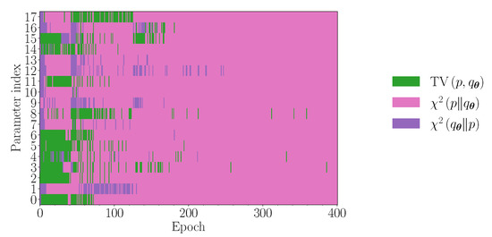Finally, in Figure 8, we illustrate the mechanics of the f-switch heuristic. In particular, we plot which f-divergence is ‘activated’ for each direction in the parameter space, at each epoch of the training in Figure 7.