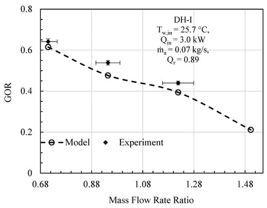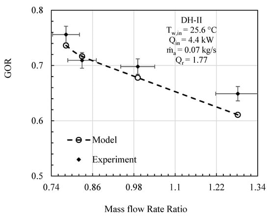 In this comparative study, mass flowrate ratio, energy input, initial water temperature, effectiveness, and relative humidity are given as input to the mathematical model, and the specific experimental test conditions are provided on each figure. The comparative analysis was performed based on gained output ratio and stream temperatures across the cycle for DH-I (Figure 3, Figure 4 and Figure 5) and DH-II (Figure 6, Figure 7 and Figure 8). DH-I means dual heated cycle consisting of 1.59 kW air heater and 1.42 kW water heater with a heat rate ratio (Qr) of 0.89. Whereas DH-II represents the case of dual heated cycle comprising 1.59 kW air heater and 2.82 kW water heater with a heat rate ratio (Qr) of 1.77. Equation (13) provides the expression for the heat rate ratio.