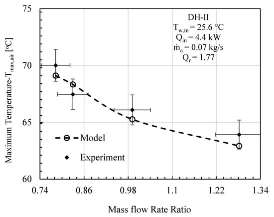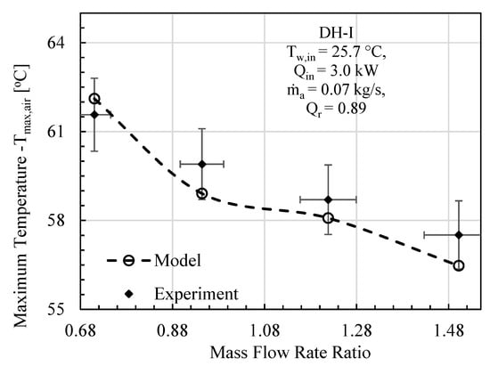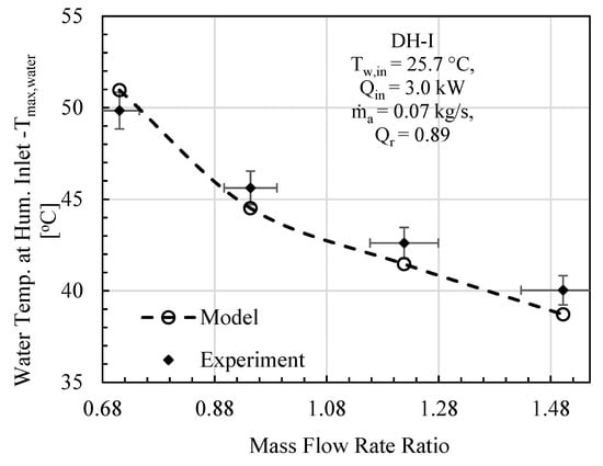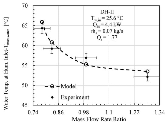 By increasing the heat rate ratio Equation (14), the overall performance of the dual heated HDH system was observed to improve. Figure 6 illustrates the comparison between the analytical and experimental performance of dual heated system with total heat input of 4.4 kW (heat rate ratio (Qr) = 1.77). A maximum percentage error of 5.89% was noticed between theoretical and experimental results at MR of 1.28. The contrast between the model and experimental data in terms of maximum cycle air temperature (Tmax,air) is given in Figure 7. The highest temperature difference between mathematical and experimental values was found to be 1.56 °C, which was recorded at mass flowrate ratio of 1.28. Similarly, maximum cycle water temperature is presented under the specified initial conditions of DH-II system in Figure 8. It has been found that maximum disparity between the experimental and analytical Tmax,water was 2.93 °C, at mass flowrate ratio of 0.99.