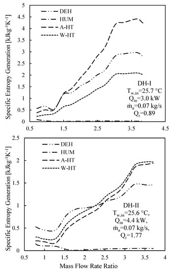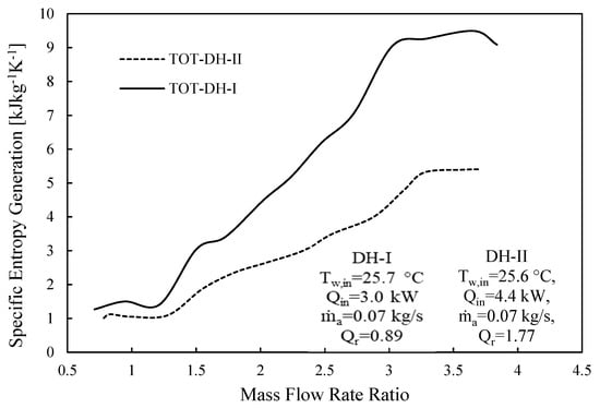 This section discusses entropy analysis based on the developed mathematical codes. Figure 9 illustrates the specific entropy generation as a function of mass flowrate ratio for the two cases under considerations (DH-I and DH-II). For DH-I and DH-II, Qr is 0.89 and 1.77, respectively. The specific entropy generation represents the cycle’s total entropy generation per freshwater mass flowrate.