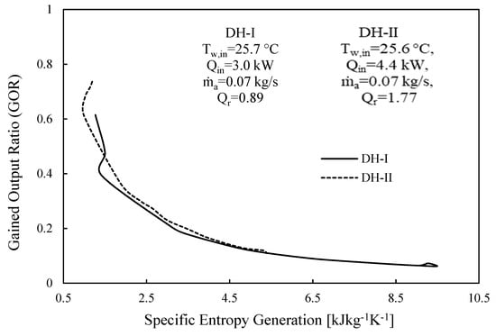 It can be noticed that the minimum specific entropy generation for CAOW-DH-I and CAOW-DH-II corresponds to the highest gained output ratio as presented in Figure 3 and Figure 6, respectively. This means that for each case, optimal condition exists at which GOR is maximized, and entropy generation is minimized. It can also be observed that the entropy generated in case of DH-I is higher than that generated in DH-II. This support the reason why the GOR in DH-II system is higher than the GOR of DH-I case. This result also shows that dual heated HDH system with heat rate ratio higher than unity is better than dual heated HDH system with heat rate ratio less than unity.