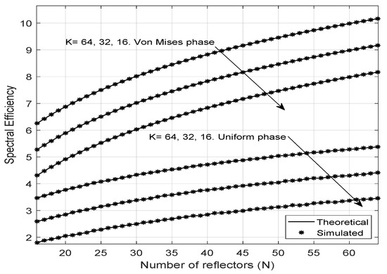 Regarding spectral efficiency, this study considers two scenarios. The first one has uniformly distributed phase noise, and the second one has a Von Mises distributed phase, as shown in Figure 6. Notably, the spectral efficiency increases when the LIS has a more significant number of reflectors, thus indicating a better sharing of the spectrum for the transmission of signals for a multiuser scenario. Moreover, the efficiency is higher for the case in which the phase errors have a Von Mises distribution and lower when the phase errors are uniformly distributed, which means that the phase adjustment of the LIS is a highly relevant factor in improving the spectral efficiency, reinforcing the importance of channel estimation and choice of the phase correction applied to reflectors. When the phase error distribution is more concentrated around zero (higher values), then the spectral efficiency is higher. Using an array of antennas on the base station can be a good choice to achieve better spectrum sharing in diverse scenarios. It is also remarkable that the result predicted by the formula proposed for the spectral efficiency is very close to the results obtained by the Monte Carlo simulation.