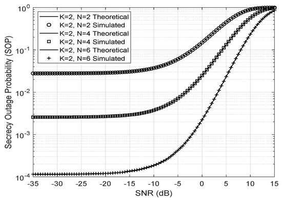 where is the SNR of the link between the source and the eavesdropper. Therefore, the SOP is defined as the probability that the instantaneous secrecy capacity, C, be less than or equal to a given capacity threshold, , which is expressed as