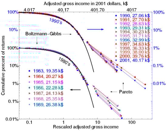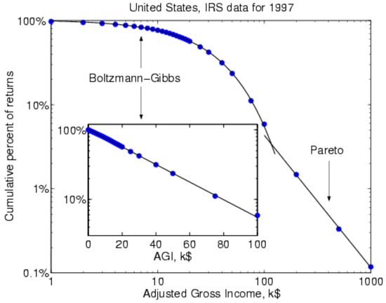 Yakovenko and Rosser [] show a model with an entropic Boltzmann–Gibbs dynamics for lower-income distribution and a Paretian power-law distributions for higher-level income dynamics. There is an assumption of the conservation of money or income or wealth, which has not held in recent years as top-level incomes have exploded although it did much more so in earlier decades. This is consistent with lognormal entropic dynamics appropriate for the majority of the population below a certain level where wage dynamics predominate, while a Pareto power law is more appropriate for the top level whose income is more determined by wealth dynamics.