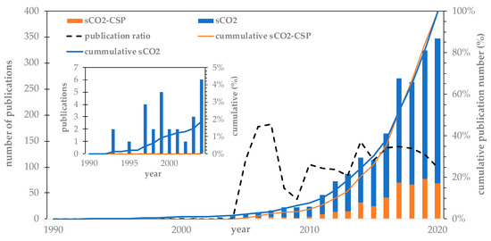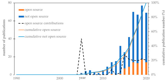 Figure 7 shows the contribution of open-access publications within the existing sCO2-CSP literature. As indicated by the cumulative values, both sources followed the same trend in terms of publication records. This translated into an average contribution of open-access sources of around 20% in recent years, where the spike in 2005 corresponds to one open-source publication of the two publications that year.