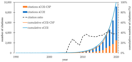 In terms of the number of citations, the contribution of sCO2-CSP-related publications is slightly higher compared to the publication ratio shown in Figure 1 because it accounts for almost 40% of the total citations, which indicates the growing relevance of CSP applications for sCO2 technologies. It can also be observed in Figure 2 that 80% of sCO2 power cycle citations were received after 2016.