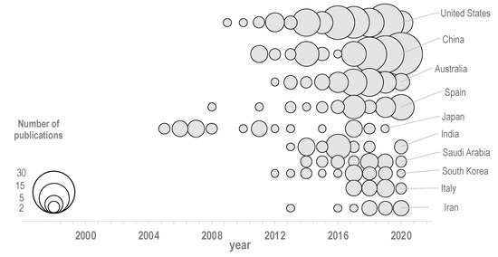Figure 4 shows a clearer picture regarding the most productive countries in terms of publishing evolution. As shown, Chinese production has grown quickly during the past 3 years, whereas the production of Japan has decreased gradually, despite being the most productive country before 2010. The growing relevance of Italy, Iran, and Saudi Arabia in recent years can also be observed.