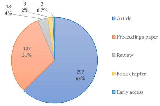 Regarding the document type distribution, Figure 5 shows that most sCO2-CSP publications are articles (63%) followed by proceedings papers (31%), with the two categories combined accounting for 94% of corpus data.
