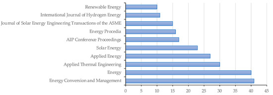 Regarding publishing sources and their connections, Table 9 summarizes the number of sources relating to the minimum number of hosted publications and received citations. As shown, sCO2-CSP-related publications have been published in 105 different sources, but only 11 sources gather 10 or more publications on this topic, as also shown in Figure 6.