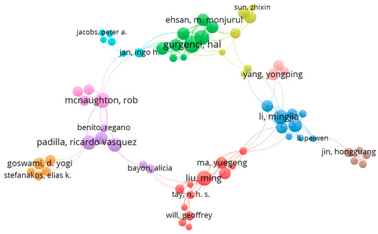 Figure 8 shows the authorship networking map for those authors fulfilling the two sCO2-CSP publications and 25 citations requirement. This criterion resulted in 152 authors; however, only 66 were connected in terms of collaborative publications that also met the minimum number of publications and citations criteria. For representation purposes, only connected authors are represented to explore their collaborations. A thesaurus was used to avoid duplications in authors’ names.