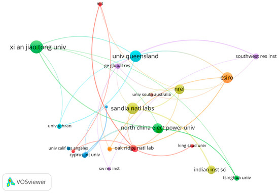 Table 4 shows the most productive organizations regarding the number of indexed publications on sCO2 power cycles for concentrating solar power applications. Research institutions are ranked according to the number of publications. The number of authors that have published in the sCO2-CSP topic under the organization affiliation is reported, in addition to the accumulated number of citations (including self-citations). The publishing ratio (PC ratio) is determined as the ratio between the number of citations and publications for a given organization. The h-index of the institution is also provided considering only the number of publications and citations for the analyzed topic [66]. As shown, the ten most productive organizations are consistent with the most productive countries, with a clear dominance of United States which has four institutions in the top 10 rankings (United States Department of Energy, Sandia National Laboratory, National Renewable Energy Laboratory, and State University System of Florida). Regarding the number of citations received by the total publications, higher PC ratios are found for Xi’an Jiaotong University (China) and Doshisha University (Japan).