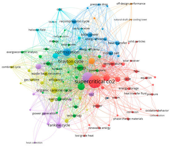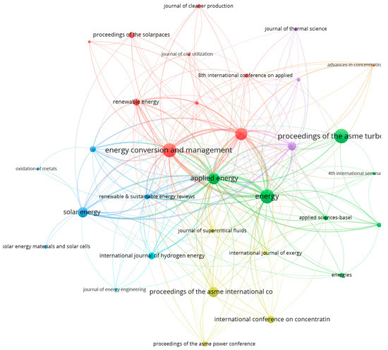 For representation purposes, Figure 10 shows network mapping connections among publishing sources having at least two publications on this topic and at least 10 citations. The sizes of the nodes indicate the number of documents of each journal, and the line thickness represents the strength in terms of citations between publications from connected journals. As shown, the journals are not all connected, which indicates that sCO2-CSP documents did not cite the other journal documents. A thesaurus was used to avoid duplications among different publishing sources, particularly for those from conference proceedings, which are grouped regardless of the year and edition. Table A3 presents the publishing sources of each cluster.