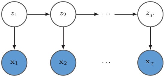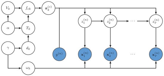 where , and A is a matrix with , with , and is a K dimensional vector with with . Furthermore, in the nonparametric version of HMM, the matrix can be assumed to obey a Dirichlet distribution, i.e., where The probabilistic graphical model is represented in Figure 1.