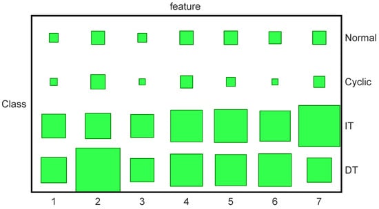 Figure 3 shows the generated synthetic data. In this experiment, 20 trajectories are used for training with 5 trajectories for each class. The classification results are presented in Table 2. The results are obtained through five-fold cross-validation. In order to illustrate that the sharing patterns have been learned by our method, the Hinton diagrams of the variational parameter V are given in Figure 4, where the occurrence probabilities of the hidden states are presented by the sizes of the blocks. For example, we can find that IT and DT share the 4th, 5th, 6th features.