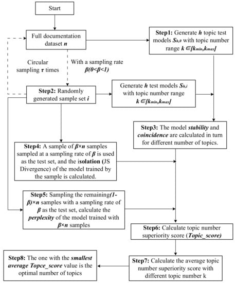To calculate the degree of model stability for different topic numbers k, first, an initial topic model is generated based on the complete dataset, and this model for the complete data is also the test model for the subsequent calculation of topic consistency, which is defined as . Second, samples are randomly selected from the overall dataset n with a sampling rate of . Third, a model is generated based on these samples as well, which is defined as . Fourth, the stability and coincidence of each random sample topic model with the test model are calculated. In addition, the remaining samples after the test samples are taken as the training set for the test samples, and the perplexity and isolation of each test sample are calculated. Finally, the k topic superiority scores of the sample models are averaged, and the minimum number of topics with the average topic superiority score value is the optimal number of topics k. The calculation steps are shown in Figure 2.