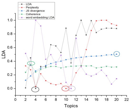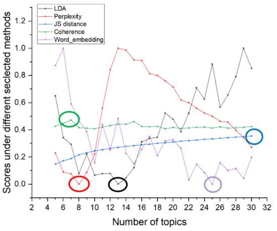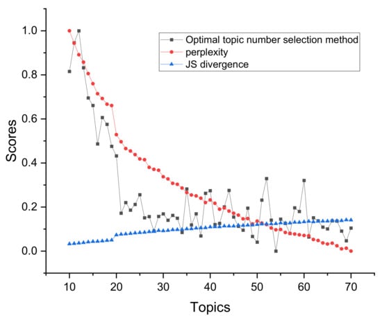 Some studies have shown that the effectiveness of topic classification in LDA models is closely related to the selection of the number of topics. If the number of topics selected is too small, the meaning under each topic will be too broad; if the number of topics selected is too large, it will lead to an over-clustering of data, producing useless topics or topics with too much similarity. To address this issue, Blei et al. (2003) proposed a perplexity model to determine the quality of topic models with different numbers of topics [3]. They compared the output results by calculating the perplexity of the topic models with different number of topics, and the smaller the perplexity, the better the model with that number of topics. Although the perplexity can judge the predictive ability of the topic training model to a certain extent, when the number of topics is selected by the perplexity, the number of topics selected is often large, and similar topics are likely to appear, resulting in a low recognition of the topics. Arun (2010) uses the JS (Kullback–Leibler) scatter to compare the similarity between topics and select the optimal number of topics, and the JS scatter is smaller when the number of topics is close to the optimal value [17]. He et al. (2015) set different genetic degrees for each topic based on topic strength, use JS (Jensen–Shannon) scatter to calculate the association between topics and screen out similar topics [18]. Both JS divergence and JS divergence methods are based on the principle that the similarity between topics separated by a good topic model should be as small as possible. The method adopted by Guan et al. (2016) uses a combination of perplexity and JS divergence to select the optimal number of topics, which combines the advantages of JS divergence and improves the problem of using the perplexity formula alone, which leads to the selection of too large a number of topics [7]. The coherence method proposed by Röder et al. (2015) evaluates the classification effectiveness of a topic by measuring the degree of semantic co-occurrence between high-probability words in the topic [19]. Greene et al. (2014) verified the topic stability of the Non-negative Matrix Factorization (NMF) model based on the similarity of the topic word lists in the training and test sets, by which a more robust number of topics can be obtained [1]. However, this method may have the problem that the topics of multiple training sets point to the same test topic.