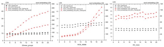 The method proposed in this study to determine the optimal number of topics for LDA has some practicality; especially when dealing with a large number of texts and a large number of topic classifications, the method has high accuracy and reliability. However, there are still some limitations in this study. First, during the experiment, we found that the deletion of stop words will have an impact on the distribution of words under each topic, and different researchers may have different treatments on the stop words, resulting in subjective bias, which can be improved and studied in the future. Second, some lexical information was not considered in this study for text processing and topic generation, but this information may affect the connotation of the topics, so lexicality and word-associated meanings can also be considered in future studies. Third, due to the natural drawback of the original LDA topic model, it cannot divide well for topics that are too similar. This leads to the fact that even though we were able to pick a relatively optimal number of topics, we did not achieve a result that is consistent with the true number of topics. Therefore, we also validate the use of our proposed method on the word-embedding LDA model, and it turns out that the optimal topic number selection method is also applicable. Since the word-embedding LDA model is better for topic classification, our final selected model is also able to better classify documents by topics. We also found through the literature collection that many works have been done by scholars in improving the accuracy of LDA topic models: for example, the Gaussian LDA model proposed by Das et al. based on the word-embedding technique [32] and the Biterm Topic Model proposed by Pan et al. for sparse matrices such as short texts [33]. Due to time and effort limitations, we do not validate all text classification models in this paper, but since our proposed method is discriminative based on topic features after the text models are trained, it can be applied to these improved topic classification models. We can foresee that if these topic classification models can achieve more accurate text classification results, then the optimal number of topics can also be better selected by using our method, and we will further verify this in our subsequent studies.