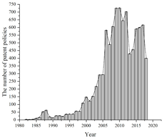 The policy texts involved in this study are obtained from the Wolters Kluwer Information Database and Peking University Law Database. The scope of collection is patent policy texts from all provinces and cities in China (excluding Hong Kong, Macau and Taiwan). Since some patent policies are included in other policy texts, in order to collect patent policies as extensively as possible, this study retrieved all policy texts with one of the following keywords in the title: patent, intellectual property, science and technology, innovation, and all policy texts with the word patent in the full text in the two databases. After removing duplicate texts and texts with less than 20 words of content, there were 9286 valid patent policy texts remaining, ranging from 1982 to 2018. As shown in Figure 34, the number of total patent policies in China is low between 1980 and 1999 (start-up period), shows a faster growth from 2000 to 2008 (growth period), and fluctuates somewhat from 2009 to 2018 (fluctuation period).