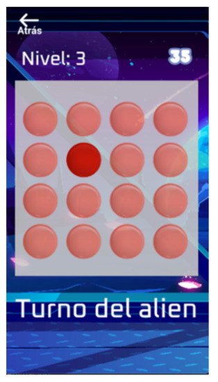 The Deary–Liewald task involves simple reaction time, which involves making a response as quickly as possible when a single stimulus is presented, and choice reaction time, which is more complicated and involves making an appropriate response to only one of the presented stimuli. In this case, the game (Figure 6) is composed of two parts. In the first part, the player is asked to pay attention to a presented window and press the button as fast as he/she can whenever an alien appears. The player must complete 2 blocks of 15 trials in this first phase. The stimulus (alien) appears at a randomly selected frequency (time between stimuli) from 1000 to 3000 ms. The second phase is the same as the previous one but presents four windows and four buttons instead of only one. The alien appears each time in one randomly selected window and the player must press the corresponding button. The game lasts until the two blocks of both phases are completed.