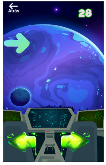 This minigame (Figure 7) focuses on reaction time and asks the player to determine the direction of a presented arrow, irrespective of the side of the screen on which the arrow appears, while piloting a spaceship. The stimulus (arrow) is presented for 1500 ms with a time between stimuli of 2000 ms. The game is composed of 2 blocks of 15 trials each and it ends either when both blocks of trials are finished or when the player fails twice in a row.
