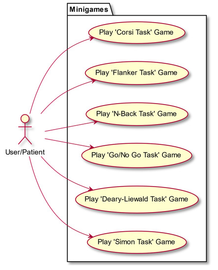 In this section we present some use-case diagrams describing the high-level functions and interactions between the system and its actors (Figure 8, Figure 9, Figure 10 and Figure 11), as well as the task activity diagram for the first minigame, Minigame 1, the Corsi task of the light sequences (Figure 12).