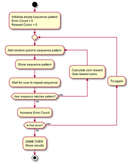 This minigame is based on visuo-spatial memory training and presents the player with a matrix of dots in which a sequence of dots is illuminated (Figure 3). The player must pay attention and remember the sequence of illuminated dots (in order) and repeat it afterwards, which requires memory for positional sequences. When the player repeats the sequence accurately, the difficulty of the game increases by making the sequence one illuminated dot longer. If the player fails when repeating a certain sequence, the sequence is repeated. If the player fails the same sequence twice in a row, then the game finishes.