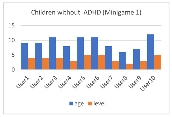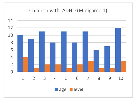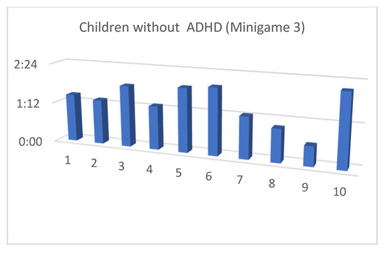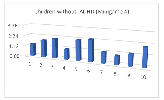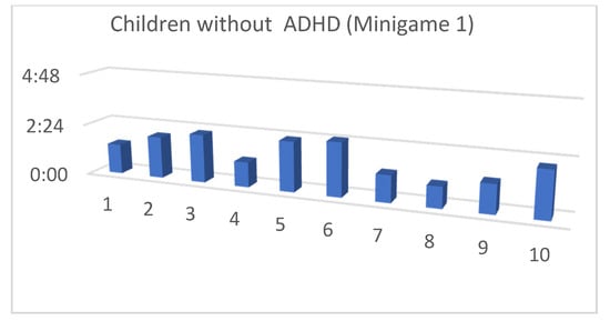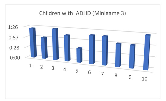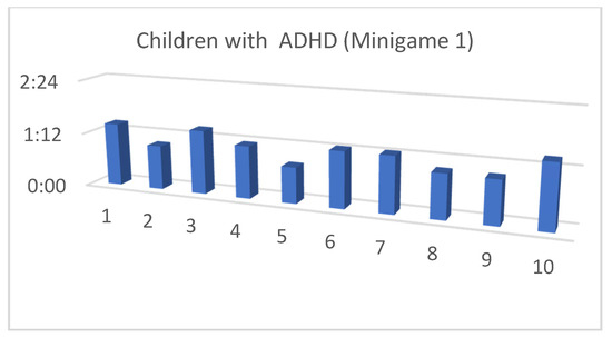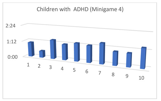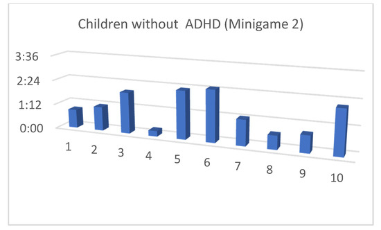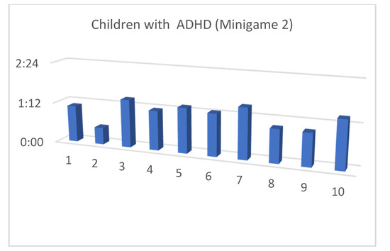Although the mean SUS score was quite similar for children with and without ADHD, we also considered that, in the context of this article, the performance time for each of the minigames and the maximum level reached by our users were both important (as shown in Figure 13, Figure 14, Figure 15, Figure 16, Figure 17, Figure 18, Figure 19, Figure 20, Figure 21 and Figure 22).
