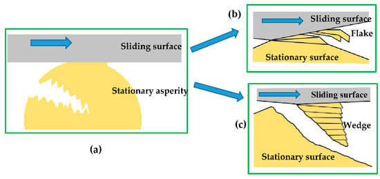 During adhesive wear [48,49,50,51,52,53,54,55,56,57], the asperities in the contacting interface tend to deform elastically and/or plastically under compression and shearing action [58,59,60,61]. The initiation of a crack in the plastically deformed asperities occurs through the combination of tensile and shearing fracture modes [62]. Once a crack is initiated, it propagates to the contacting interface and generates wear particles (see Figure 1a). The shape of the wear particles depends on the magnitude of the adhesive binding. Generally, the adhesive binding along the interface of asperities generates slip along the slip planes resulting in flake-like shear tongues (see Figure 1b). If the plastic deformation in the contact region is large, a wedge-like shape wear particle is formed (see Figure 1c) [63].