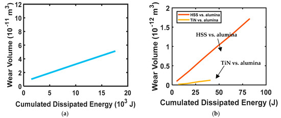 Fouvry et al. [93] investigated the wear behavior of TiN-alumina and high-speed steel (HSS)-alumina tribo-pairs by performing bidirectional sliding experiments and reported a linear correlation between wear volume and dissipated energy for both tribo-pairs with R2 greater than 0.85. The linear fit is shown in Figure 3b. Similar observations were reported by Celis et al. [94] for hard-coated steel and alumina balls at different RH values.